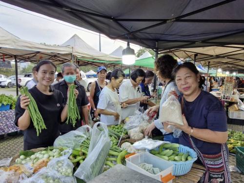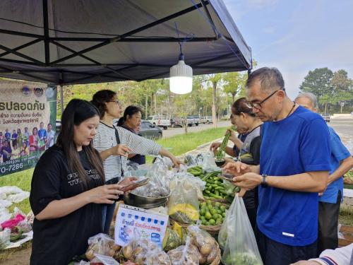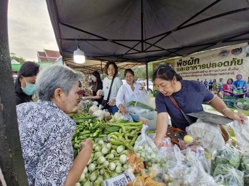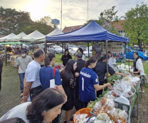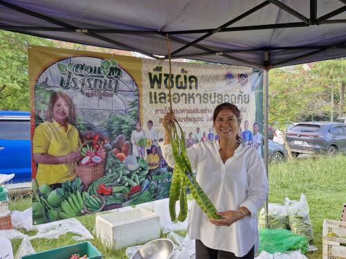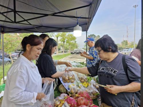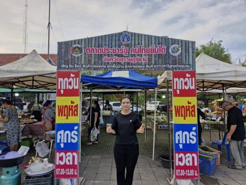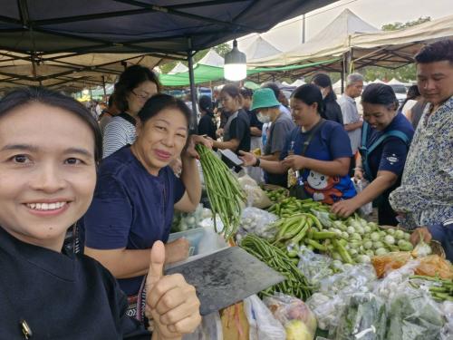 นางละลินดา แดงก่อเกื้อ พัฒนาการอำเภอคีรีรัฐนิคม ลงพื้นที่เยี่ยมเยียน ให้กำลังใจ และร่วมอุดหนุนสินค้า OTOP–คนละครึ่ง ของเครือข่ายผู้ประกอบการ OTOP และเครือข่ายโคก หนอง นา ในพื้นที่ โดยมี นางปราถนา จันทรณะ ผู้ประกอบการจากตำบลบ้านยาง อำเภอคีรีรัฐนิคม นำสินค้าจากกลุ่มผักปลอดภัยจากแปลงผลิตในชุมชน ซึ่งเชื่อมโยงผลผลิตจากโครงการโคก หนอง นา และครัวเรือนสัมมาชีพชุมชน ในพื้นที่ มาจำหน่ายภายในตลาด เพื่อเพิ่มรายได้แก่ครัวเรือนและส่งเสริมการบริโภคพืชผักปลอดภัยในพื้นที่