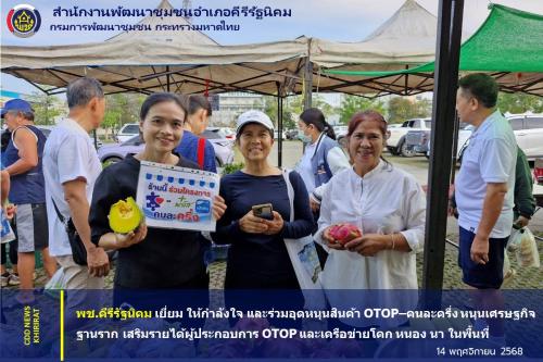 นอกจากนี้ ยังได้ประชาสัมพันธ์โครงการ “คนละครึ่ง พลัส” ซึ่งเปิดรับสมัครตั้งแต่วันที่ 15 ตุลาคม – 19 ธันวาคม 2568 เพื่อเปิดโอกาสให้ผู้ผลิต ผู้ประกอบการ OTOP และร้านค้ารายย่อย เข้าร่วมเป็นร้านค้าในโครงการฯ เพิ่มช่องทางการจำหน่ายสินค้า สร้างรายได้ และกระตุ้นเศรษฐกิจฐานรากให้เข้มแข็งอย่างยั่งยืน การลงพื้นที่ครั้งนี้ยังเป็นการสร้างขวัญกำลังใจแก่ผู้ประกอบการ เสริมความเข้มแข็งของเครือข่าย OTOP และเครือข่ายโคกหนองนา พร้อมทั้งช่วยประชาสัมพันธ์ช่องทางสนับสนุนของรัฐ เพื่อผลักดันเศรษฐกิจฐานรากของอำเภอคีรีรัฐนิคมให้เติบโตอย่างยั่งยืน