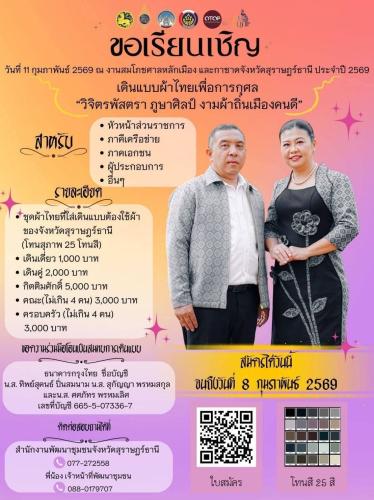 1) ประชาสัมพันธ์ ขอเชิญร่วมกิจกรรมเดินแบบผ้าไทยเพื่อการกุศล ในงาน “สมโภชศาลหลักเมือง และกาชาดสุราษฎร์ธานี ประจำปี 2569” โดยจังหวัดสุราษฎร์ธานี ขอเชิญชวน หัวหน้าส่วนราชการ ภาคีเครือข่าย ผู้ประกอบการ ภาคเอกชน และอื่น ๆ ทุกเพศ ทุกวัย เดินแบบผ้าไทยเพื่อการกุศล “วิจิตรพัสตรา ภูษาศิลป์ งามผ้าถิ่นเมืองคนดี” ในวันที่ 11 กุมภาพันธ์ 2569 👉สมัครได้วันนี้จนถึงวันที่ 8 กุมภาพันธ์ 2569