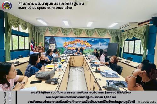 นางละลินดา แดงก่อเกื้อ พัฒนาการอำเภอคีรีรัฐนิคม พร้อมด้วยนางสาวผกาวรรณ ราชรักษ์ นักวิชาการพัฒนาชุมชนปฏิบัติการ ร่วมกับ นางอาภรณ์ กลางรักษ์ ประธานคณะกรรมการพัฒนาสตรีอำเภอ (กพสอ.) คีรีรัฐนิคม และคณะกรรมการพัฒนาสตรีอำเภอคีรีรัฐนิคม (กพสอ.) ดำเนินการประชุมฯ เพื่อเตรียมความพร้อมการดำเนินงาน โครงการเสริมสร้างศักยภาพเพื่อพัฒนาสตรี จังหวัดสุราษฎร์ธานี ปี 2569 ซึ่งอำเภอคีรีรัฐนิคมจะนำพลังสตรีเข้าร่วมงาน จำนวน 1,000 คน ในกิจกรรม ซึ่งประกอบด้วย ขบวนนางรำ ขบวนของแต่ละโซน การเดินแบบผ้าไทย การรับเกียรติบัตรให้กับสตรีด้านการพัฒนาชุมชน ด้านการพัฒนาสังคม ทีมตำส้มตำลีลา การแสดงจากกลุ่มสตรีโซนขุนเขา บูธของดีอำเภอคีรีรัฐนิคม และบูธ OTOP ของอำเภอคีรีรัฐนิคม